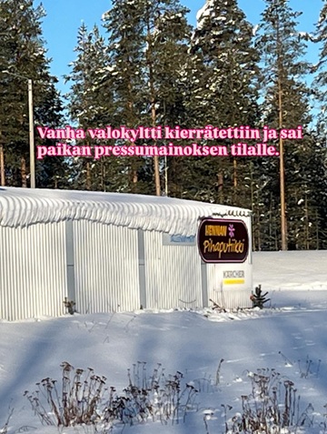 Vanha valokyltin pohja kierätettiin ja laitettiin uudet tarrat toiselle puolelle ja sijoitettiin kulahtaneen pressumainoksen tilalle Siilinjärven suunnalta tuleville.