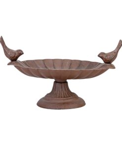Lintujen kylpyallas matalalla jalalla.  Kaksi lintua altaan reunalla. Halkaisija 23,5 cm, korkeus 14,5 cm. Materiaali: valurauta, väri ruskea..