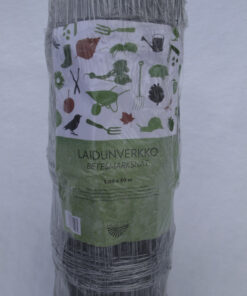 MYYDÄÄN MYYMÄLÄSTÄ NOUDETTUNA. Lammas- ja eläinaitaverkko.  Galvanoitua teräslankaa.  Langan vahvuun 2 mm. Silmäkoko kasvaa alareunasta yläreunaan.  Pystylankojen väli 15 cm, silmäkorkeudet alkaen 8,5 cm, ylhäällä 20 cm. Verkon korkeus 1,2 metriä, rullan pituus 50 metriä.