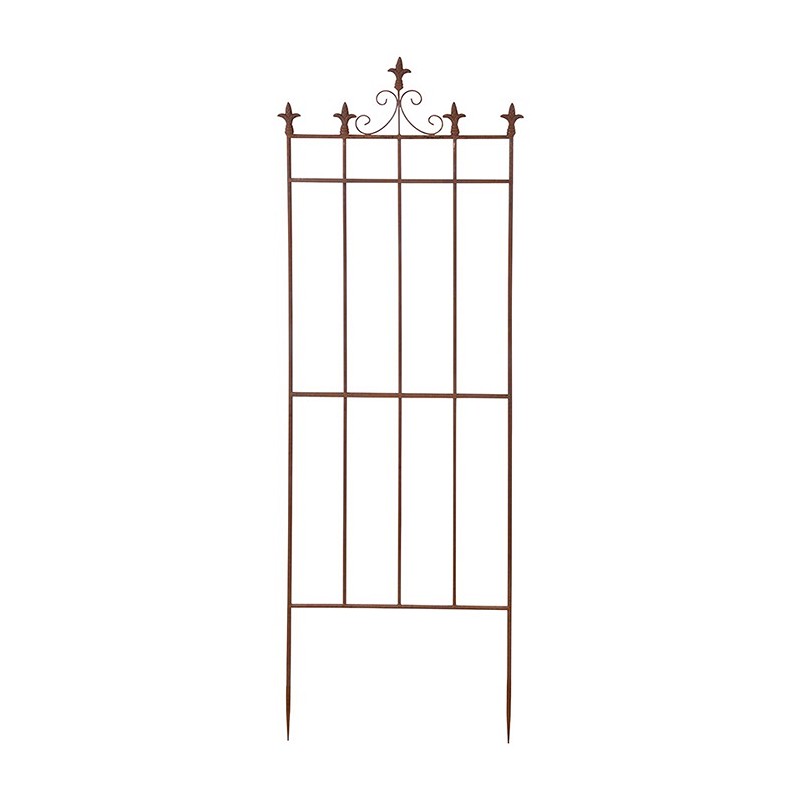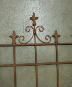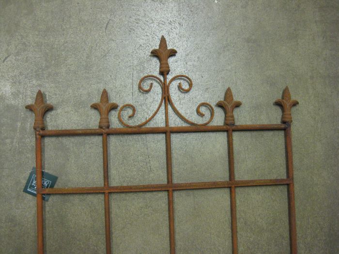 Koristeellinen, ruosteenvärinen aita, köynnöskehikko. Korkeus 165 cm, leveys 54 cm. Kaksi erilaista.