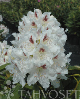 Kukat ovat suuret ja koristeelliset. Valkoisen kukan yläterälehdellä on suuri tummanvioletti laikku ja kukinnot ovat silmiinpistävän näyttäviä kesäkuussa.