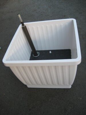 Neliskanttinen valkoinen altakasteluruukku.