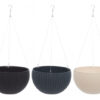 Kierrätysmuovista valmistettu amppeli, joka sisältää välipohjan. Välipohjan alla on 2 cm korkea vesitila. Korkeus 18 cm, halkaisija 19,5 cm. Vahvat ripustusnarut, väri harmaa. Amppelin väri vaalea violetti.