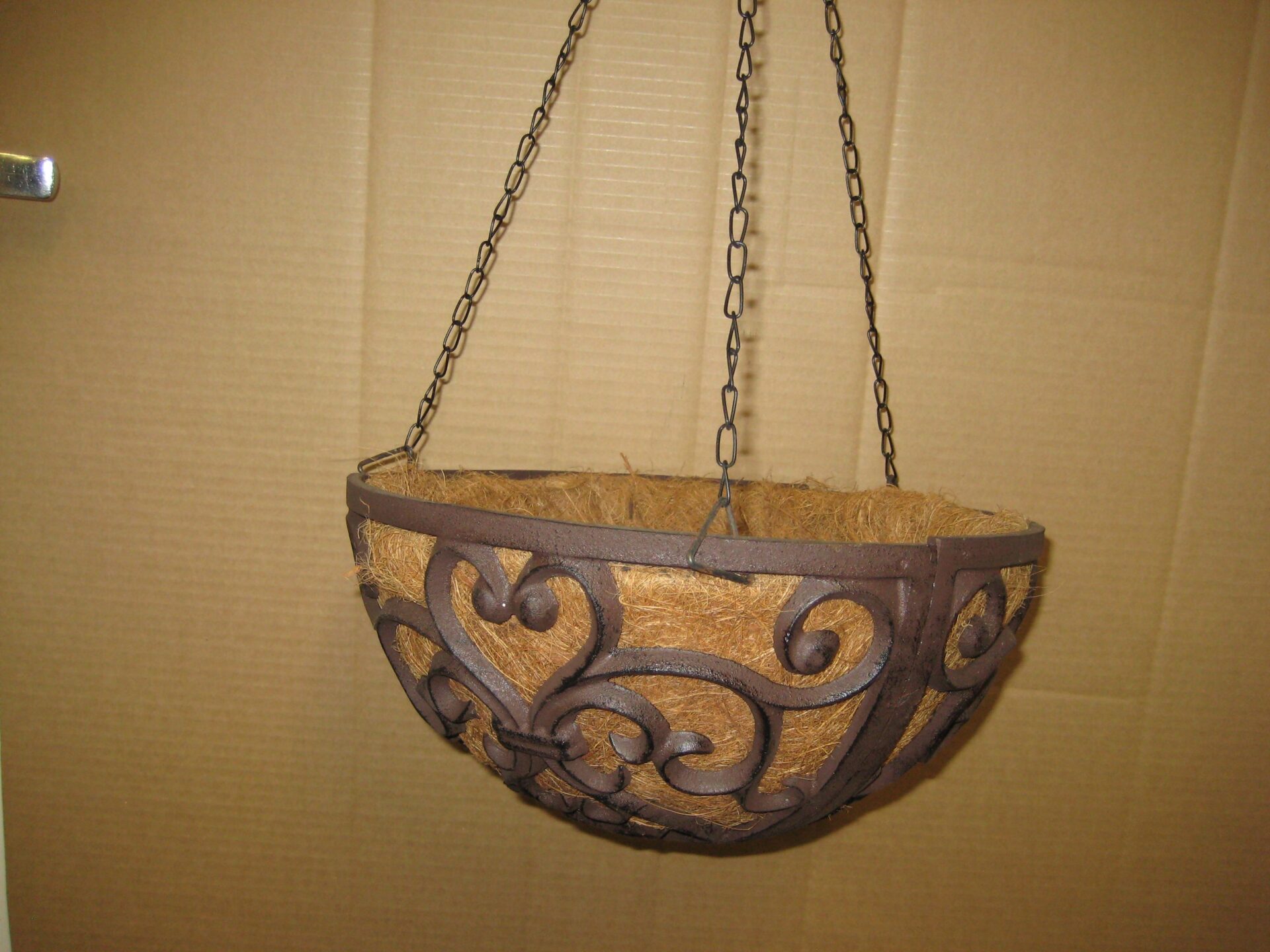 Ruskea amppeli, valurautakehikko, jossa kookos -sisus. Metalliketjut.