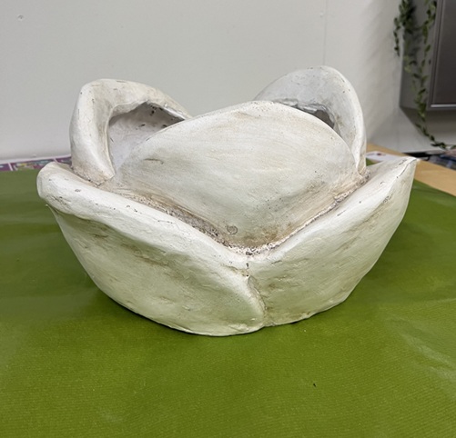 Veneen mallinen ruukku. Pituus 38 cm, korkeus 9 cm. Materiaali savea, väri valkoinen. Pohjassa ei ole reikää.