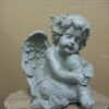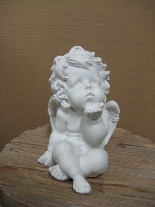 Valkoiseksi maalattu enkeli, materiaali sementtiä. Korkeus 9 cm, leveys 14 cm.