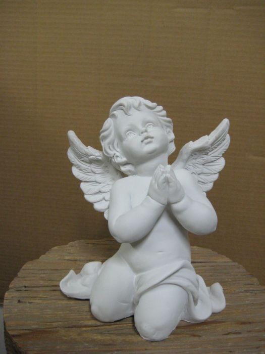 Enkeli, jonka katse on luotu ylös. Korkeus 21 cm, leveys 18 cm.