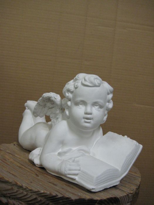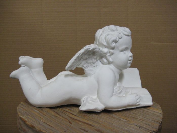 Valkoiseksi maalattu enkeli, materiaali sementtiä. Korkeus 9 cm, leveys 14 cm.