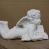 Valkoiseksi maalattu enkeli, materiaali sementtiä. Korkeus 9 cm, leveys 14 cm.