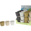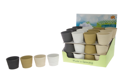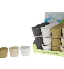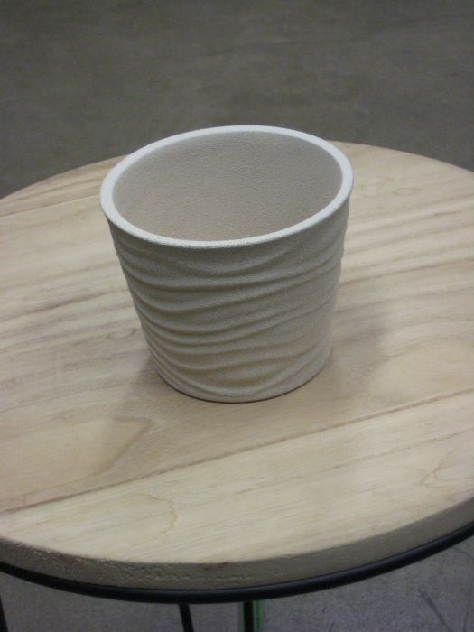 Kierrätysmuovista valmistettu muoviruukku. Korkeus 23 cm, halkaisija 25 cm. Pohjassa ei ole reikää.