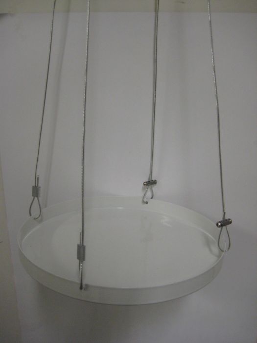 Alustan halkaisija 24 cm, väri valkoinen. Kannattimet muovitettua metallia, pituus 70 cm.