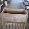 Kukkalaatikko, jossa on jalat sekä laatikon lisäksi ritilätaso alhaalla. Laatikossa mukana katekangas. Ritilätasolla voi pitää kasviruukkuja tai puutarhan työvälineitä. Kokonaiskorkeus 78 cm, laatikon sisäkorkeus 23 cm. Leveys 78 cm, syvyys 40 cm. Materiaali ruskeaksi käsitelty puu.