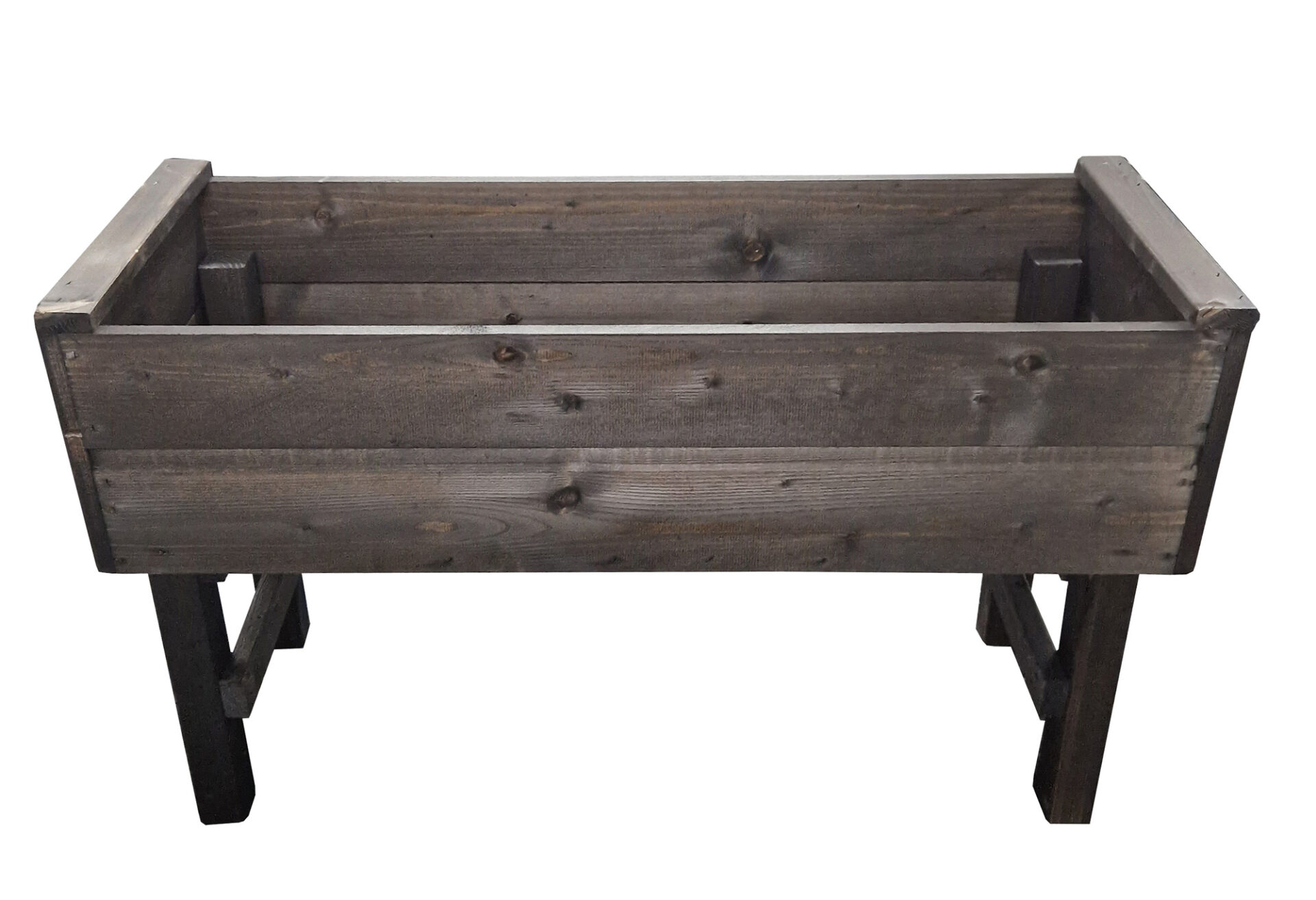 Puinen kukkalaatikko, jossa on jalat.