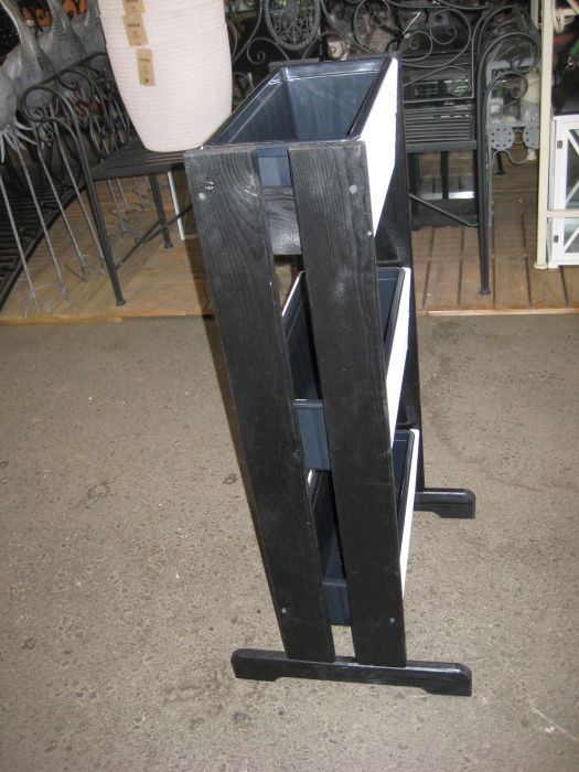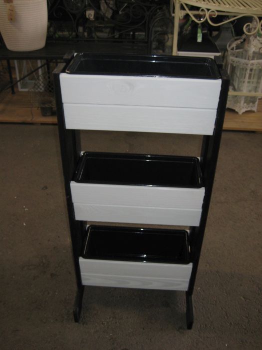 Kolmella parvekelaatikolla varustettu puinen teline.
