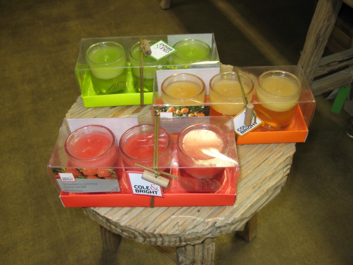 Kolme kappaletta mansikan tuoksuista kynttilää lasiastiassa.