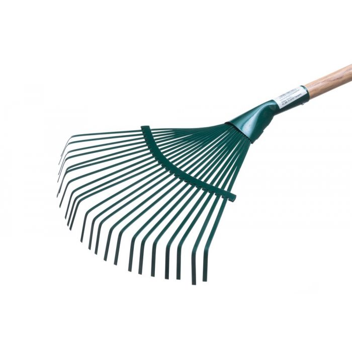Metallinen lehtiharava, väri vihreä. Terän leveys 40 cm. Puuvarsi, jonka pituus on 140 cm.