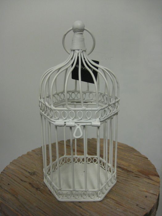 Metallinen häkki, josta häkkiosa irtoaa erilleen. Voi laittaa kukkia tai koristeita. Kokonaiskorkeus 38 cm, halkaisija 18 cm.