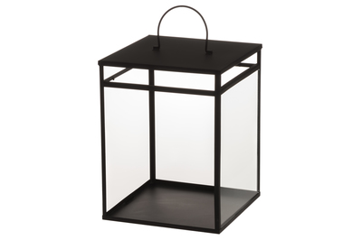 Tyylikäs, musta metallilyhty. Korkeus 32 cm, lyhtyosan koko 15×15 cm. Materiaali metalli ja lasi. Lyhdyn sivut yläosasta avoimia katon kohdalla.