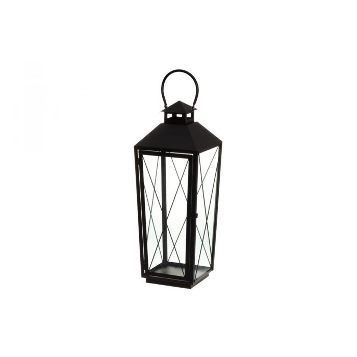 Tyylikäs, musta metallilyhty. Korkeus 44 cm, lyhtyosan koko 23×23 cm. Materiaali metalli ja lasi. Lyhdyn sivut yläosasta avoimia katon kohdalla.