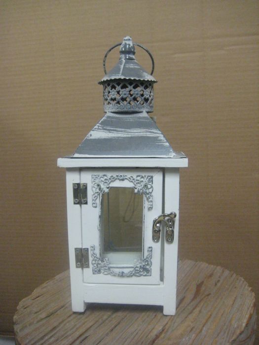 Metallilyhty, jonka koko on 12,5 x 12,5 cm ja korkeus 33,5 cm. Väri antiikinvalkoinen.