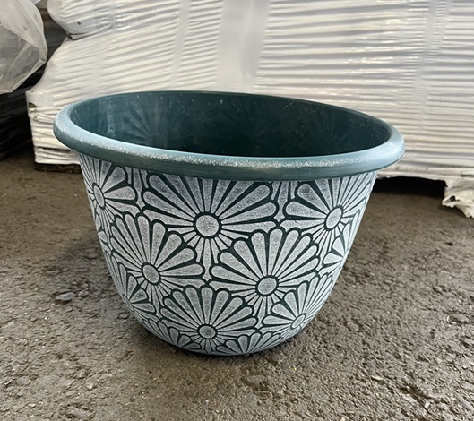 Kaunis vihreä-valkoinen muovi ruukku, jossa on vahva kontrasti, mikä tuo kukka kuvion upeasti esiin.