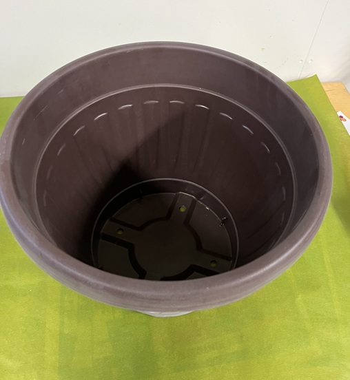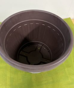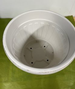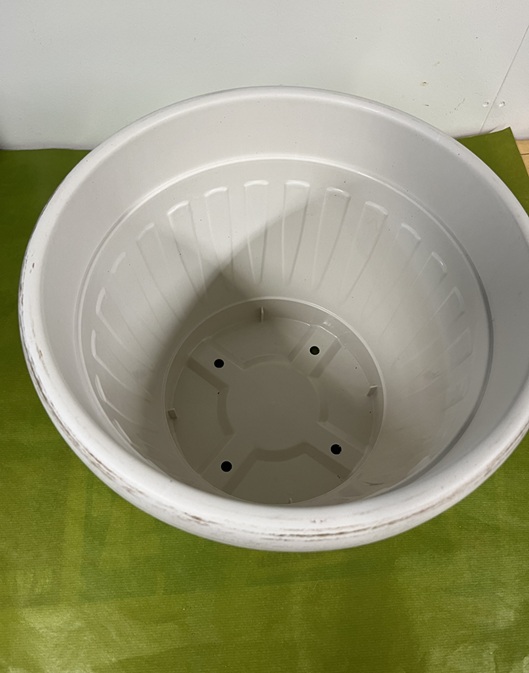 Kierrätysmuovista valmistettu muoviruukku. Korkeus 23 cm, halkaisija 25 cm. Pohjassa ei ole reikää.