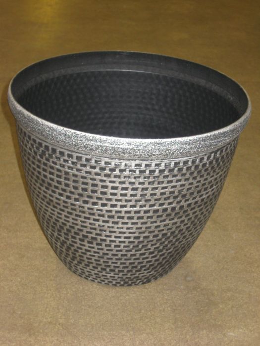 Kaunis muoviruukku, jossa hopeanvärinen kuviointi. Tähän ruukkuun saa näyttävät kesäkukkaistutukset ja käy myös sisäruukkuna.