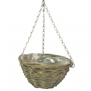 Kaksivärinen pajuamppeli, muovi sisällä, sisältää ketjut. Pituus 25 cm, leveys 18 cm, korkeus 15 cm.