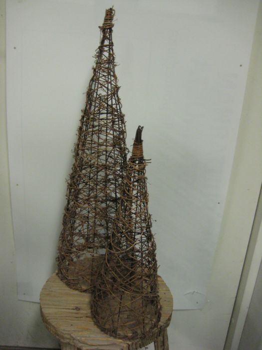 Metallinen, kartion mallinen kehikko, johon on kudottu pajua. Korkeus 60 cm, halkaisija alhaalla 20 cm. Käyttö koristeena siltään tai tukikehikkona köynnöstäville kasveille.