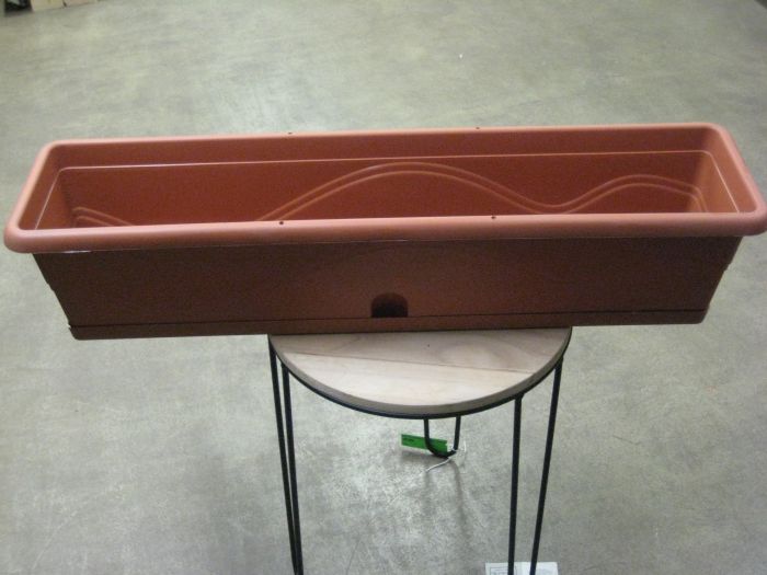 Kukkalaatikko, jossa on mukana alunen. Kastelumahdollisuus alhaalta kasteluaukosta.