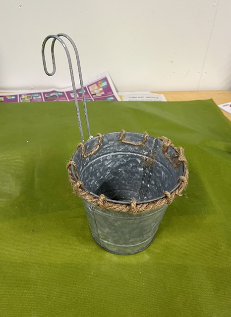 Koukulla varustettu peltiruukku, jossa juuttinaru koristelu.