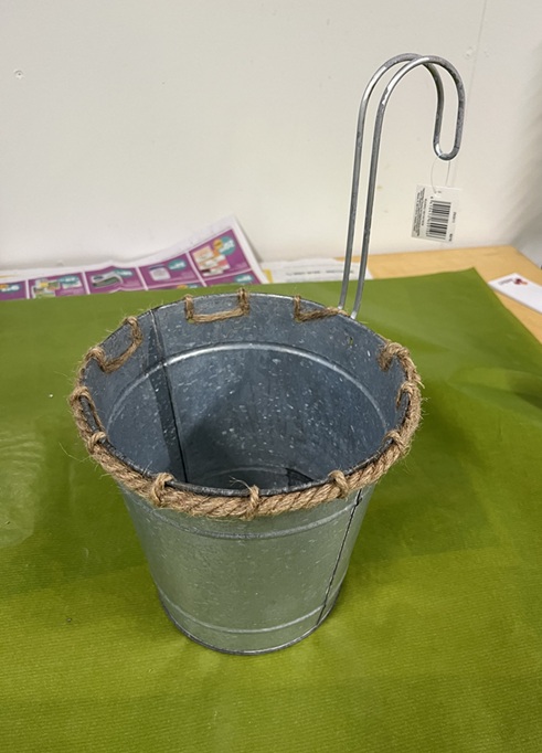 Koukulla varustettu peltiruukku, jossa juuttinaru koristelu.