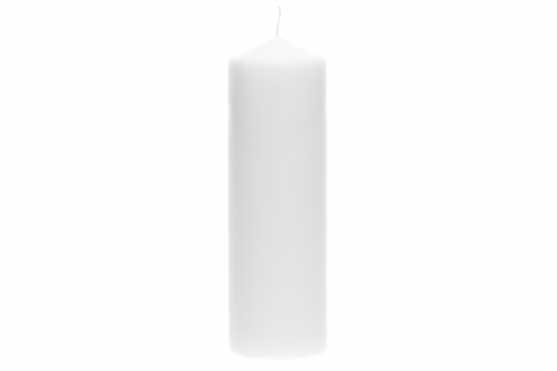Valkoinen pöytäkynttilä. Korkeus 25 cm, halkaisija 8 cm.
