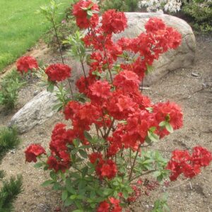 Puistoatsalea ’Nabucco’:lla on loistavan punainen, runsas kukinta touko-kesäkuussa. Kukat ovat suuria.