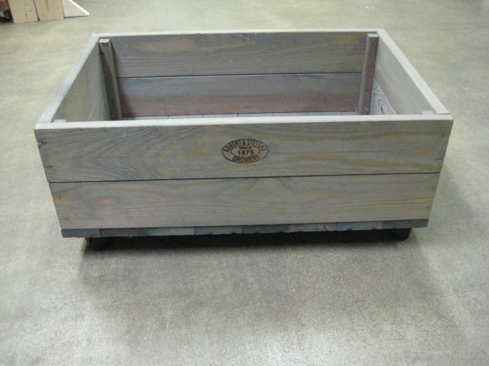 Puinen kukkalaatikko, väri ruskeanharmaa. Narukahvat. Pituus 36 cm, leveys 20,5 cm, korkeus 14,5 cm.