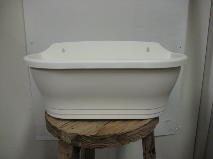 Veneen mallinen ruukku. Pituus 38 cm, korkeus 9 cm. Materiaali savea, väri valkoinen. Pohjassa ei ole reikää.