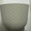 Jämäkkä saviruukku, jossa on kaunis lehtikuvio. Korkeus 10,5 cm, halkaisija 11,5 cm. Väri luonnonvalkea, kuviointi harmaa. Pohjassa ei ole reikää.