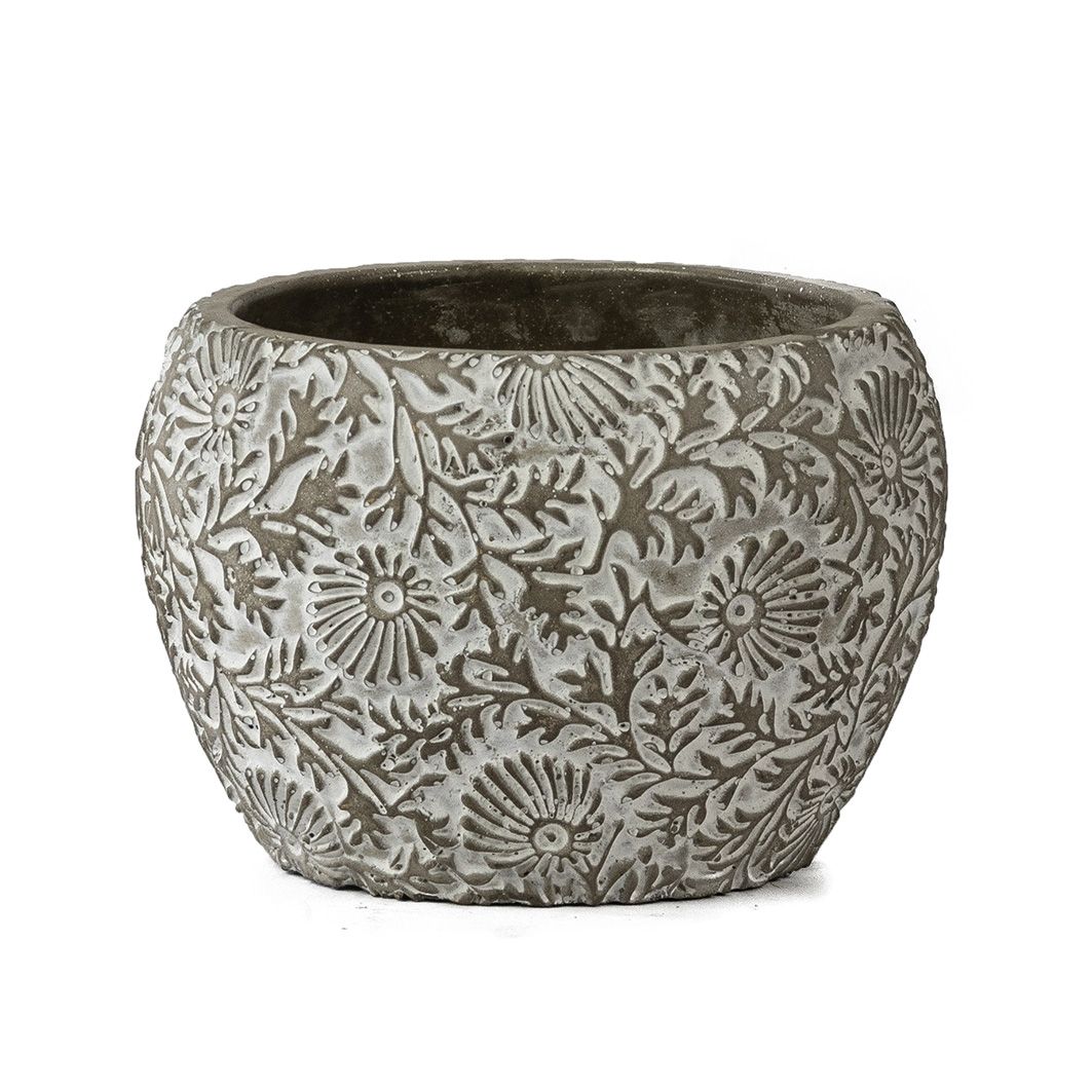 Kaunis, kukka- ja lehtikuviolla koristeltu keraaminen ruukku.