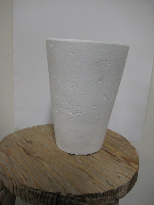 Tyylikäs ylöspäin levenevä saviruukku, joka on maalattu valkoiseksi.