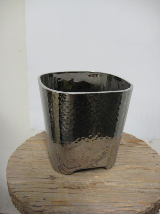Kaunis hopean värinen kantikas ruukku, keramiikkaa.