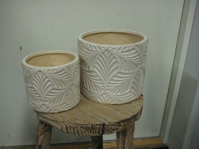 Kaunis keraaminen ruukku, jossa on lehtikuvio.