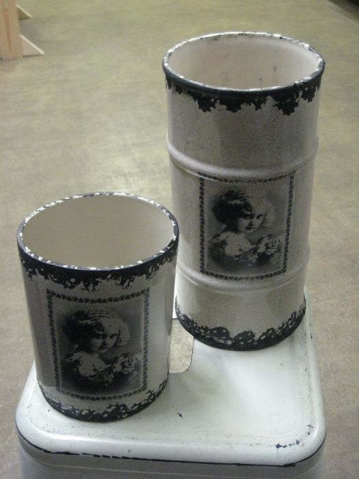 Keraaminen ruukku tai maljakko, jossa on retrohenkinen kuva kyljessä.
