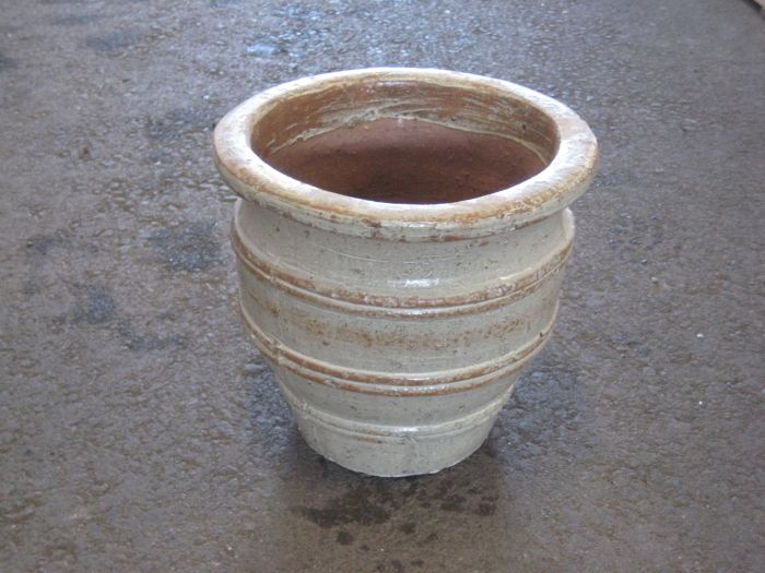 Näyttävän kaunis, lasitettu vaalea saviruukku. Pohjassa reikä.