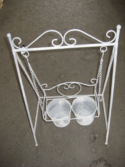 Metallinen ruukkuteline, jossa on kaksi ruukkua. Väri vaaleanharmaa.
