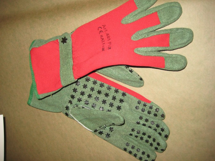 Puutarhakäsineet, jossa käsineen sisäosa on nahkaa estäen ruusun piikkejä pistämästä, päällysosa vahvaa kangasta. Käsineen varressa kiristyslenkki.