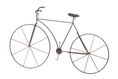 Upea, metallinen polkupyörä, jonka voi ripustaa seinälle koristeeksi. Mukana paikat kiinnitysruuveille.