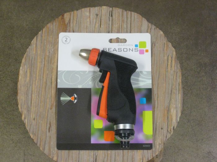 Laadukas kastelupistooli, jossa on metallinen säätöruisku veden tulon voimakkuuden säätämiseen.