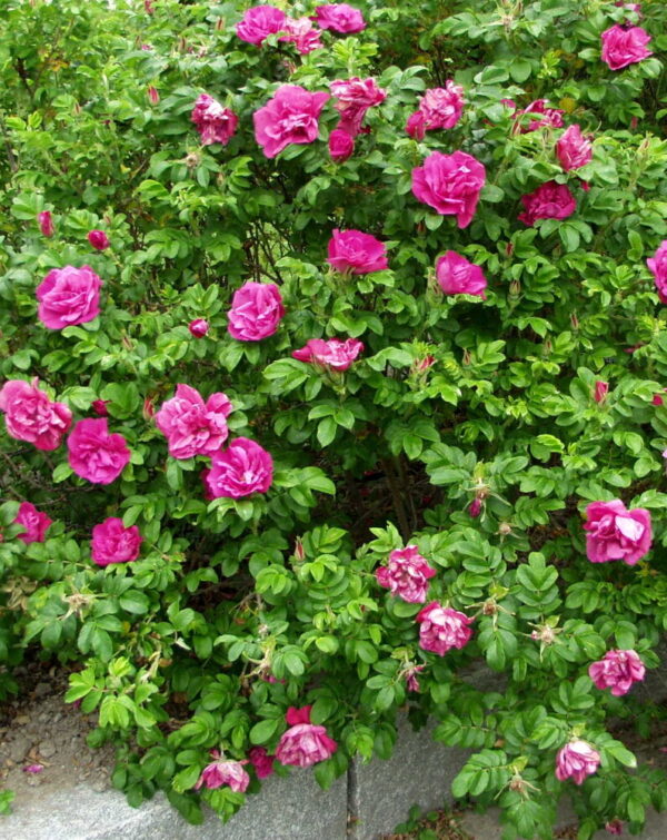 Matalakasvuinen pensasruusu, joka kukkii kesäkuun lopulta pitkälle syksyyn.